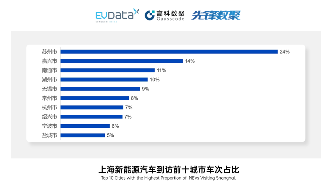 本文还对节日期间出行车辆的到访地进行了分析,上海新能源车主的足迹遍布全国333个地级行政区中的321个,从日喀则到三亚,从吐鲁番到香港都有他们的身影。本文将前十目的地城市的到访车次占比展示在图中。以苏州为例,到访车次占前十城市中到访车次总和的24%。与今年五一期间的城市到访情况相比较,杭州市的到访排名从第五名下降到了第七名。本文认为部分原因是由于亚运会期间杭州采取了较为严格的交通管制措施,部分自驾游车主选择避让出行所致。